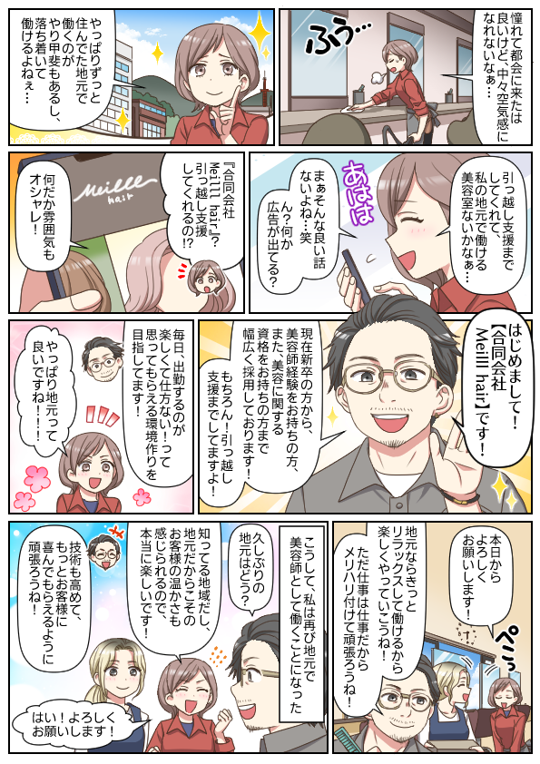 | おすすめポイント | ライフスタイルに合わせて選べる雇用体制を用意! プライベートを大事にしながら、長く活躍できるサロン ・社会保険完備 ・完全週休2日制 ・有給休暇あり(土日祝の取得OK) ・遅くとも18時半ごろに退勤可能 ・住宅手当あり ・引越し手当あり ・営業中レッスン可能 ・最短1年以内のデビューも目指せます ・ママさん美容師さんも大歓迎 ・産休育休取得実績あり |